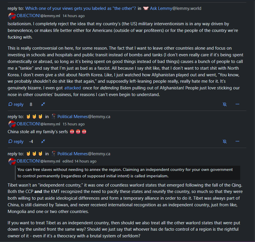 arrow-up142arrow-down1imageML goons have zero self-awareness. Pro-isolationism in all cases (but imperializing Tibet is okay) media.piefed.socialPugJesus@piefed.socialEnglish · 21 days agomessage-square13fedilink