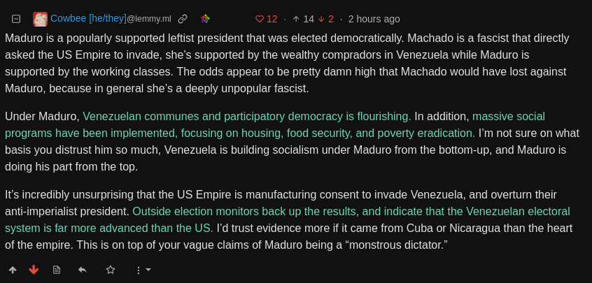 GrammarPolice@lemmy.worldEnglish · 17 days agoDeranged tankie simps for Maduro citing that he's "popularly supported"plus-squarelemmy.worldimagemessage-square15fedilinkarrow-up145arrow-down15