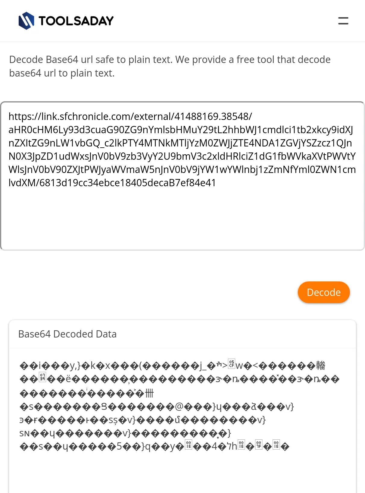 $ python3 ./decode.py 'https://link.sfchronicle.com/external/41488169.38548/aHR0cHM6Ly93d3cuaG90ZG9nYmlsbHMuY29tL2hhbWJ1cmdlci1tb2xkcy9idXJnZXItZG9nLW1vbGQ_c2lkPTY4MTNkMTljYzM0ZWJjZTE4NDA1ZGVjYSZzcz1QJnN0X3JpZD1udWxsJnV0bV9zb3VyY2U9bmV3c2xldHRlciZ1dG1fbWVkaXVtPWVtYWlsJnV0bV90ZXJtPWJyaWVmaW5nJnV0bV9jYW1wYWlnbj1zZmNfYml0ZWN1cmlvdXM/6813d19cc34ebce18405decaB7ef84e41' https://www.hotdogbills.com/hamburger-molds/burger-dog-moldThis script works by spitting the URL at ‘/’ characters and then recombining the parts (right-to-left) and checking if that chunk of text can be base64 decoded successfully. If it does, it then takes any printable ASCII characters at the start of the string and outputs it (to clean up the garbage characters at the end). If there’s more than one possible valid interpretation as base64 it will print them all as it finds them.