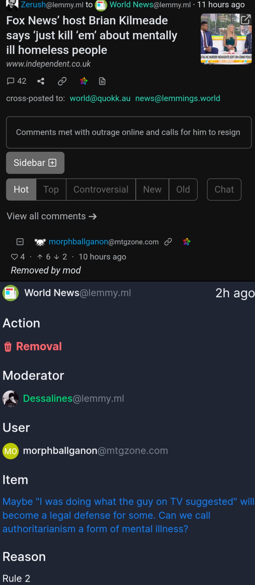 I really dislike how some mods like to refer to rules by their number. It just makes things needlessly opaque, it’s part of the “You meet me where I’m at, because I am your superior” mindset. In this case it makes it kind of hard to even see what he’s claiming the issue is with this. Is it because it’s referring to mental illness in a sort of ableist way? Eh, maybe that’s a little bit legit. But that would be a different rule? Honestly, it just reads like dessalines lets his hamster wander around on the mod controls sometimes, or anything he takes personal offense to he likes to delete from the comments, and he takes personal offense very very easily.