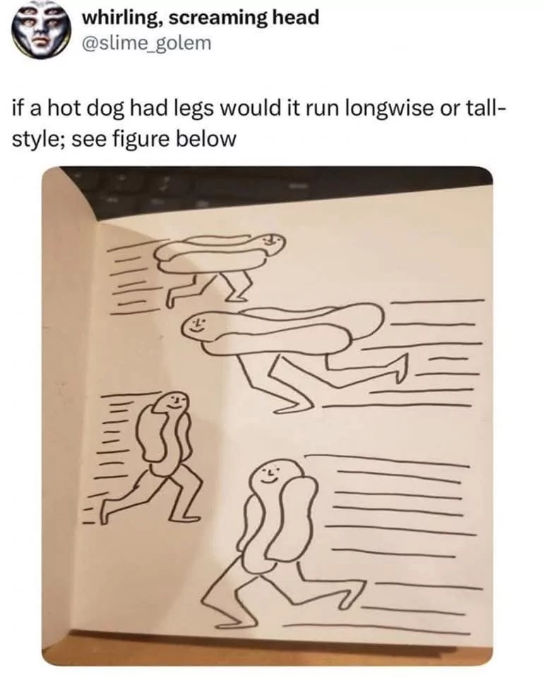 I mean obviously the long way, because that’s how hotdogs are generally anthropomorphized.