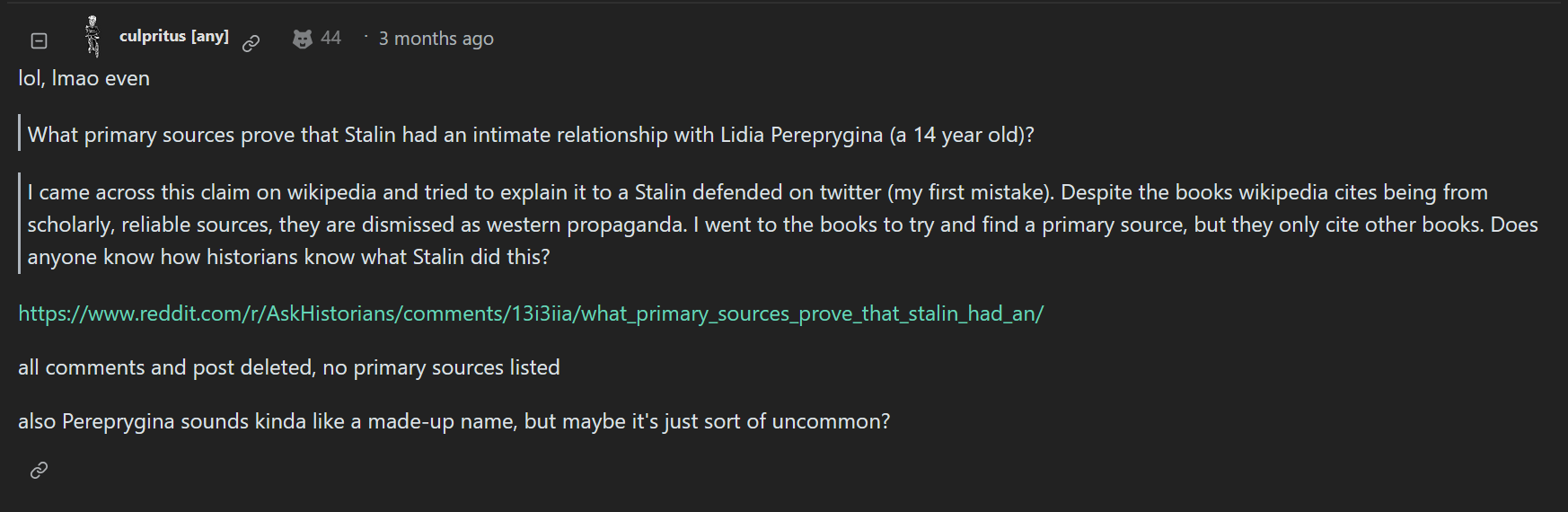 goat@sh.itjust.worksM to MeanwhileOnGrad@sh.itjust.worksEnglish · 1 month agoTankies don't think Lidia Pereprygina, Stalin's 13-year-old lover, is a real personsh.itjust.worksimagemessage-square7fedilinkarrow-up145arrow-down13