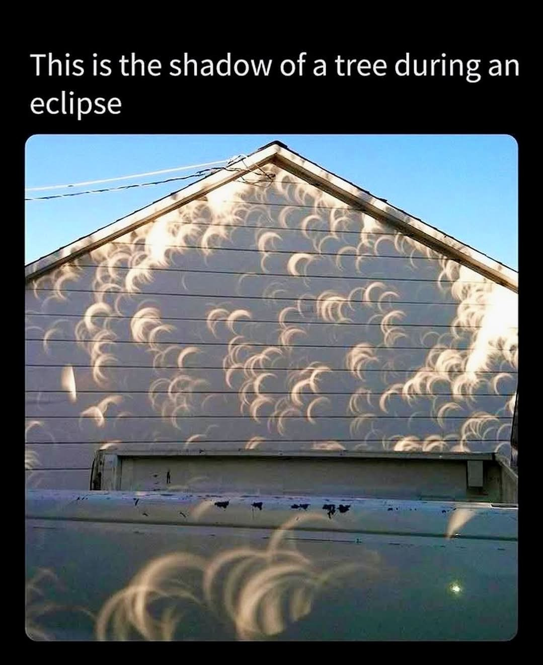 You can make a hole with your fingers and see the patterns of very bright lights above you, stadium lights etc. It’s just a vertical camera obscura. I remember the 90s solar partial eclipse really well because I was riding home from school, the leaves and even the spokes on my bike projected moons everywhere, it was completely magical.