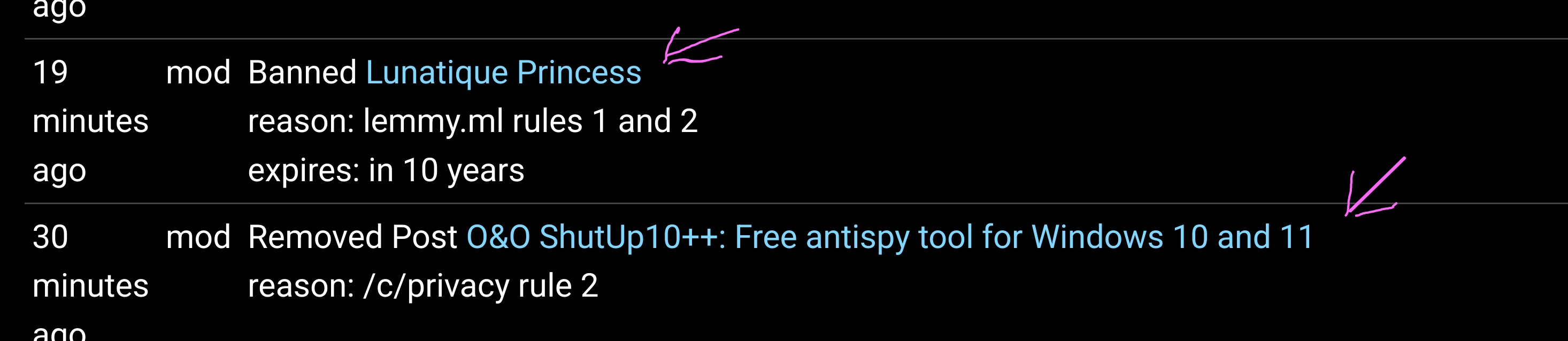 https://lemmy.ml/modlog?page=1&actionType=All&userId=22696071