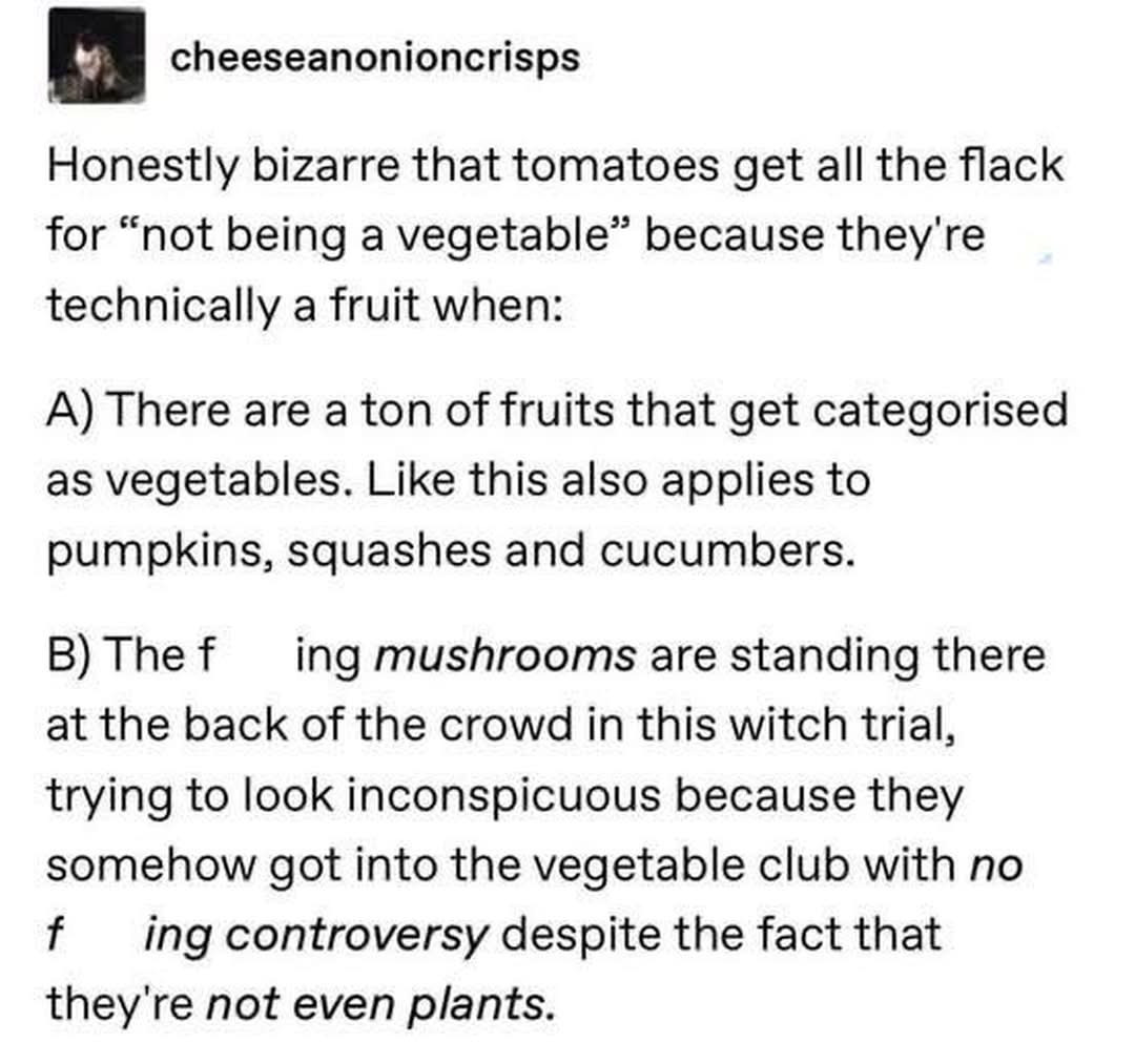 At no point have our options ever only been “fruit or vegetable,” but yeah I guess if you tell people those are their only choices of course they’ll adhere. But like… I’ve never known anyone who though those were the only choices?