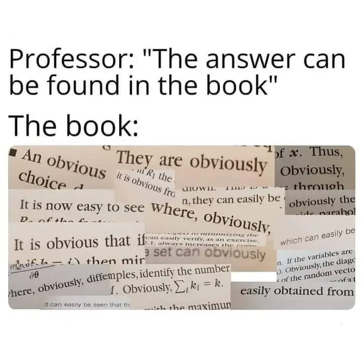 - Old joke. - Professor writes a formula on the blackboard. He says “Obviously, this is…” Then he stops, looks at the formula and rushes out of the room. - The next day class resumes. the professor walks in with a big smile on his face. - “I was correct. It is obvious!”