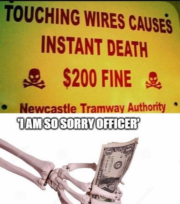 The worst part is, if the sign only said the instant death part, it would be a worse deterrent. Like, despite how funny it is to also have a fine, it’s a much more useful sign like this.