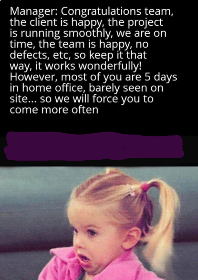 But also once you get to the office it’s all just hotel cubes with insufficient conference space. So everyone will still do their meetings virtually on teams, but now with extra steps.