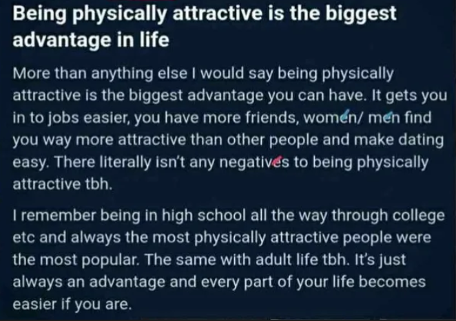 Women have much higher rates of being sexually assaulted than men. But unwanted sexual harassment can increase with both sexes which is an objective negative. More attractive women are also more likely to have their intelligence questioned compared to a more attractive male. There are also issues of not knowing if people like you for your character or just your appearance that negatively affects everyone. The point is life isn’t just better in every way if you are attractive there are some downsides as well