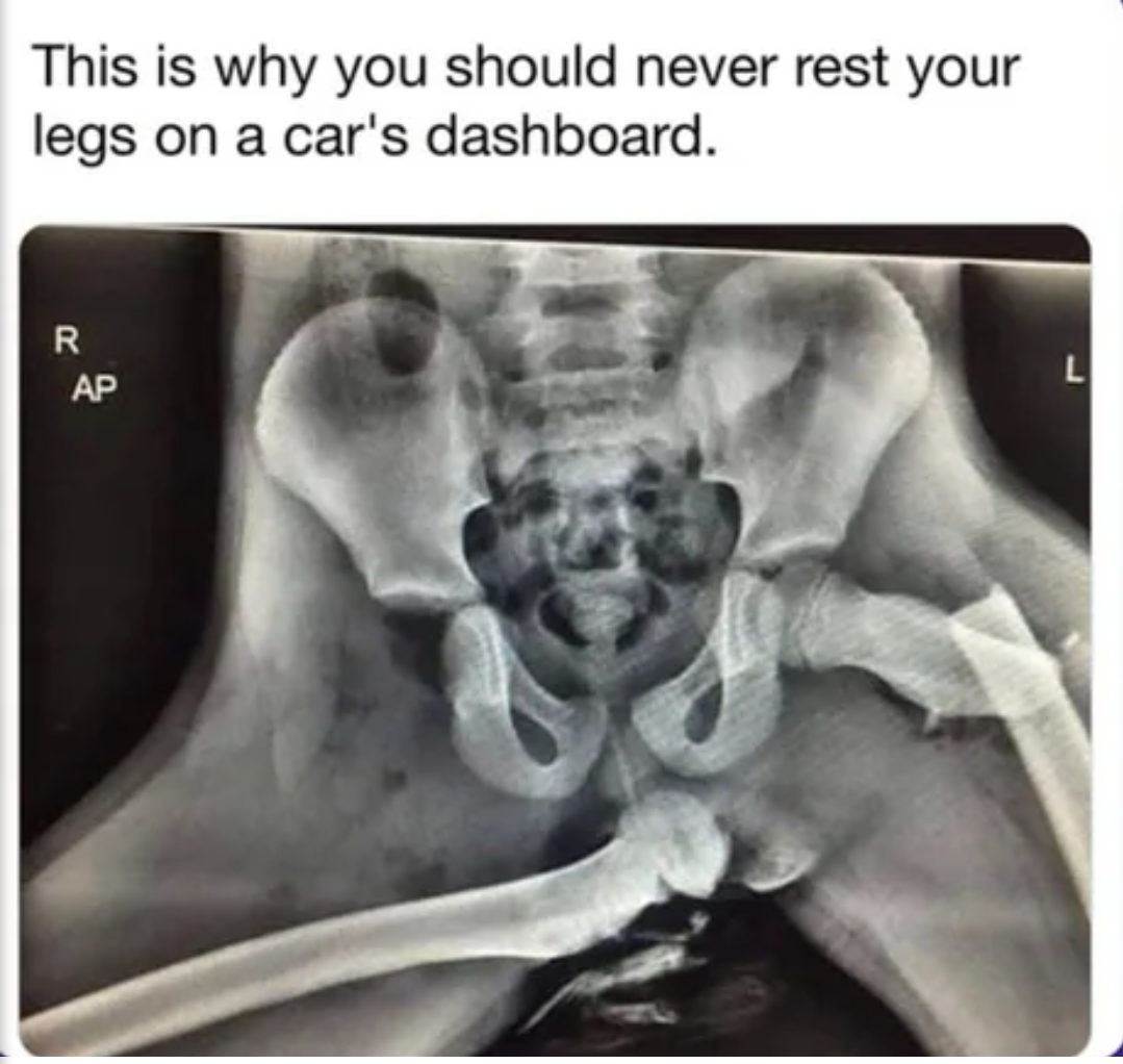 I assume some kind of force – airbag or emergency brake – slammed their legs into their body, dislocated the hip joint and pushed the femur sideways and into their pelvis.