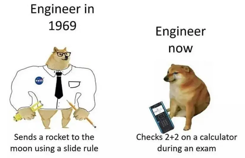 - Okay look, some of the math I do on a daily basis is like 5 levels above basic addition (it looks like I’ve written a whole ass sentences of gibberish) but like what if they changed it? I’d rather be sure that 2+2 still equals 4 than be wrong and the thing I’m working on ends up making expensive sounds. - There’s also just removing the cognitive load of having to process this information. You’re allowed to look up the answer (that’s what a calculator and the slide rule do). - Using the tools you have to speed up your work doesn’t make you a worse engineer than those in the past. You’re building off their work so you don’t have to constantly literally reinvent the wheel. - Yup. If I’m not ballparking, all math goes through a calculator. It’s already there, and I’m already using it. “Trust, but verify”.