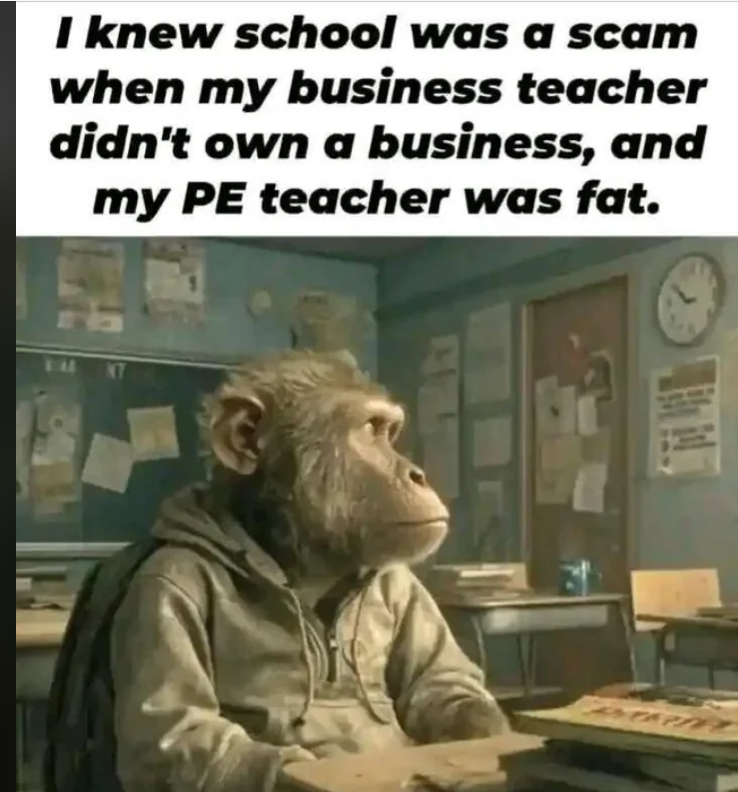 More importantly im complaining about the meme. Specifically that a lot of PE teachers in schools were first in some kind of sport. Coaching isn’t as physically demanding as the sport itself and muscle starts becoming fat.
