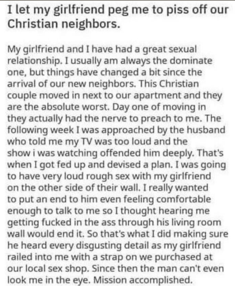 minus-squarecRazi_man@europe.publinkfedilinkarrow-up19·19 days agoOr even just leaving a porn video at loud volume. But hey, everyone’s entitled to enjoy a good pegging. You don’t need to wait to spite your neighbours to do this.