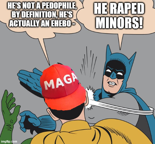 So, in my opinion, the response to “ackshually he’s not a pedophile” should be “you’re right, he sex trafficked and raped minors. Better now?”