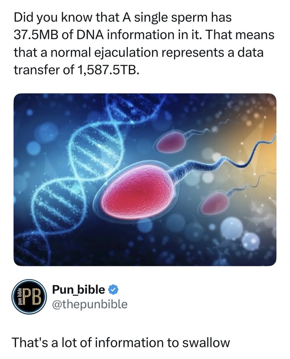 So what would the total amount of information in an average ejaculation be? Dumb it down for me, please? Lol
