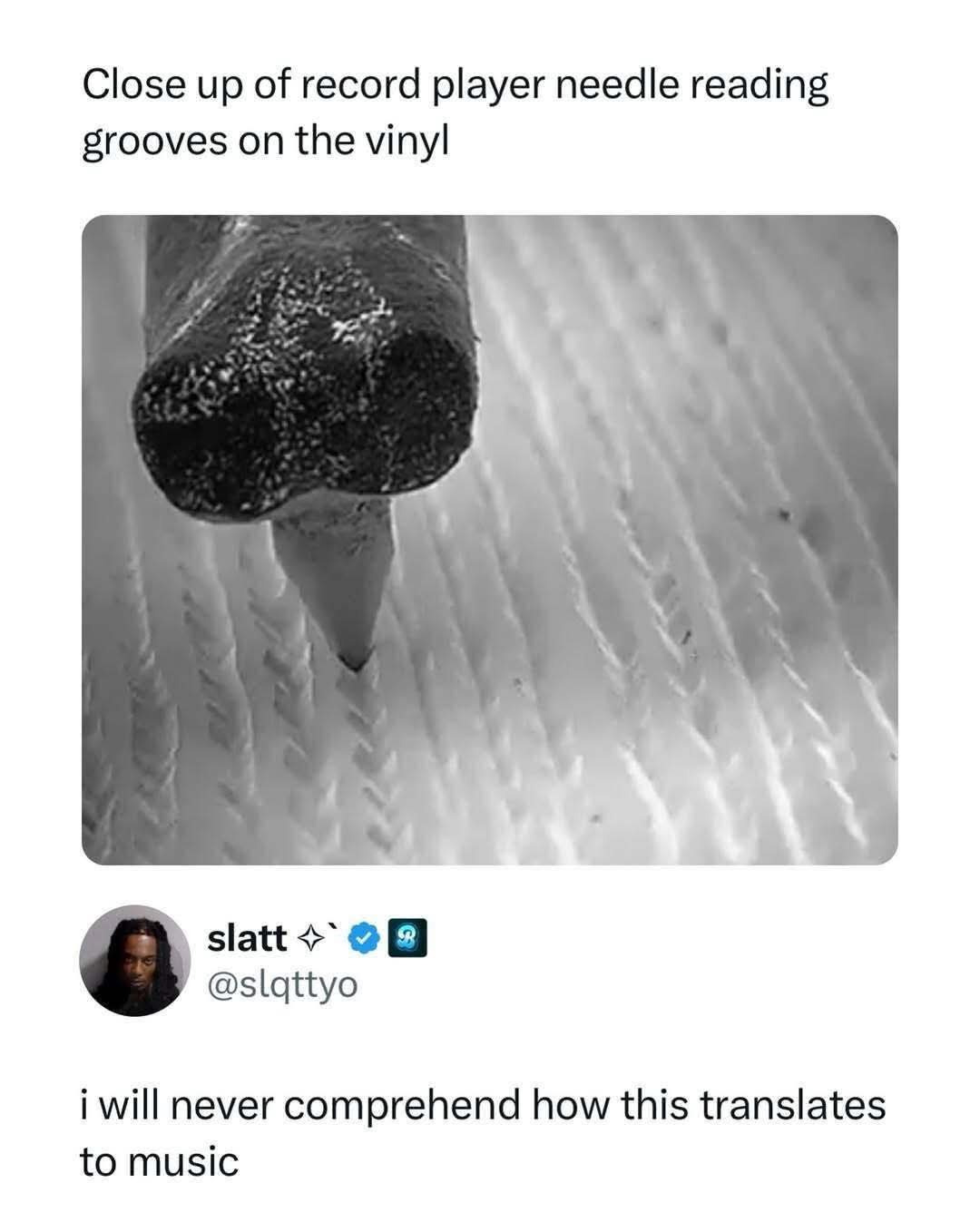 It’s not that hard to grasp I don’t think. If you understand graphs of soundwaves, it’s literally just the wave scratched into the plastic. The movement of the needle dictates the movement of the speaker membrane which results in the same movement in your eardrum. Which is what you percieve as sound.