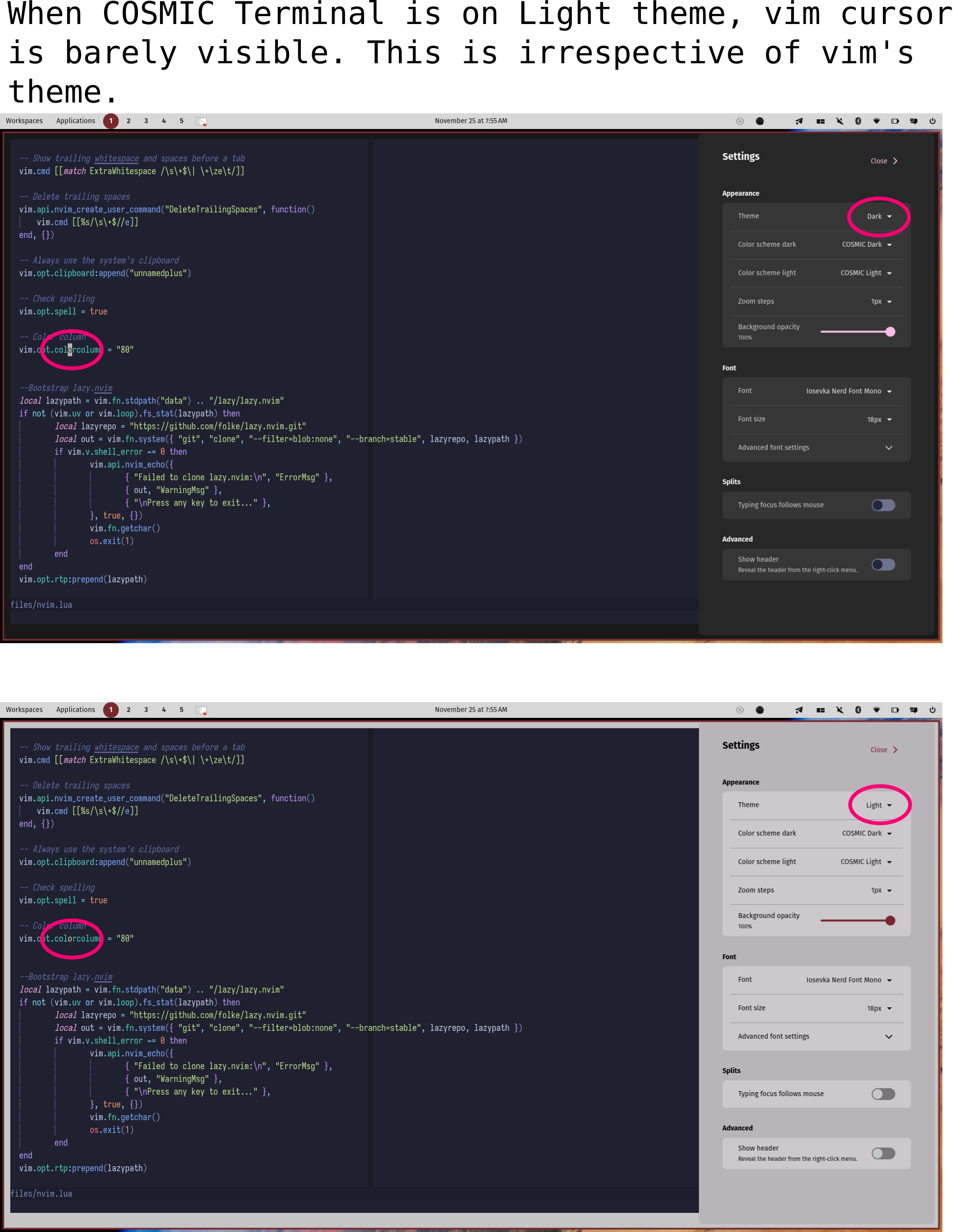 When COSMIC Terminal is on Light theme, vim’s cursor is barely visible.