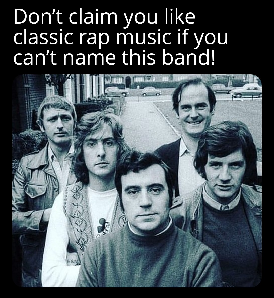 They originally were the Knights Who Say Ni, but broke up for a while for some solo work, then reunited as The Knights Who Say Ekki Ekki Ekki Pitang Zoom Boing. Best rap album ever, with the chart topper “Only a Flesh Wound”.