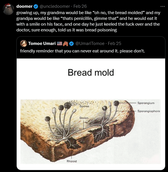 So I can’t actually find anything from a quick search that tells me what “bread poisoning” is. Searches show results for both moldy bread as well as ergotism. Just about every source on the Internet tells me that eating a bunch of moldy bread should just give you a bad case of shits or vomits. But if someone is immunocompromised or has gut issues it could be worse.