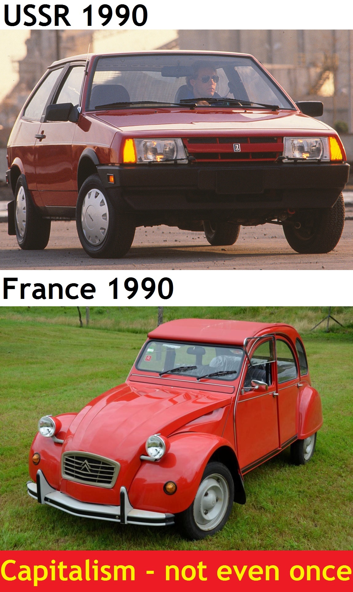 I’m pretty sure the car in the top picture is a Lada Samara made by AvtoVAZ, which was a company started in the 60s as a project between Fiat and the USSR. And the first car it made was a slightly modified and rebadged Fiat 124. So, I’m not sure you can claim capitalism wasn’t involved.