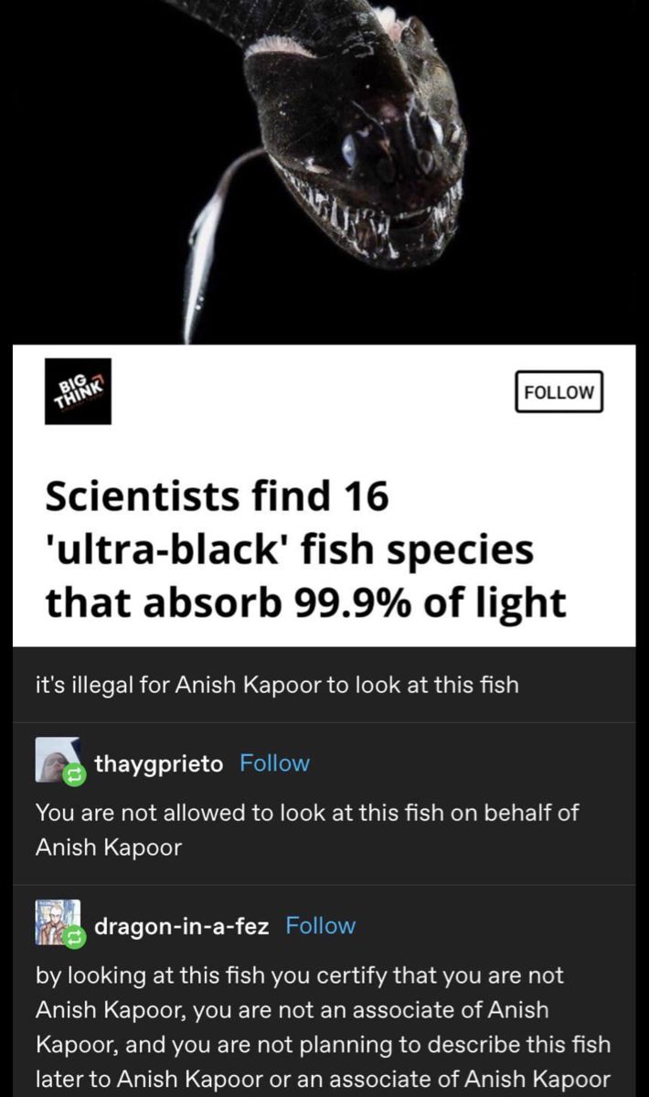Hey Anish, this fish is black, like real black. Blacker than that. Way super black. Oh also Stuart told me to tell you “Suck it, Anish.”