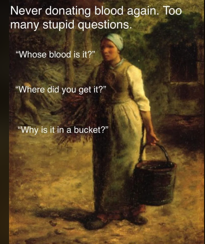 Mickey7@lemmy.world to Lemmy Shitpost@lemmy.world · 5 days agoTried to do the right thing and donate blood today. Never again too many BS questions.lemmy.worldimagemessage-square6fedilinkarrow-up1242arrow-down14