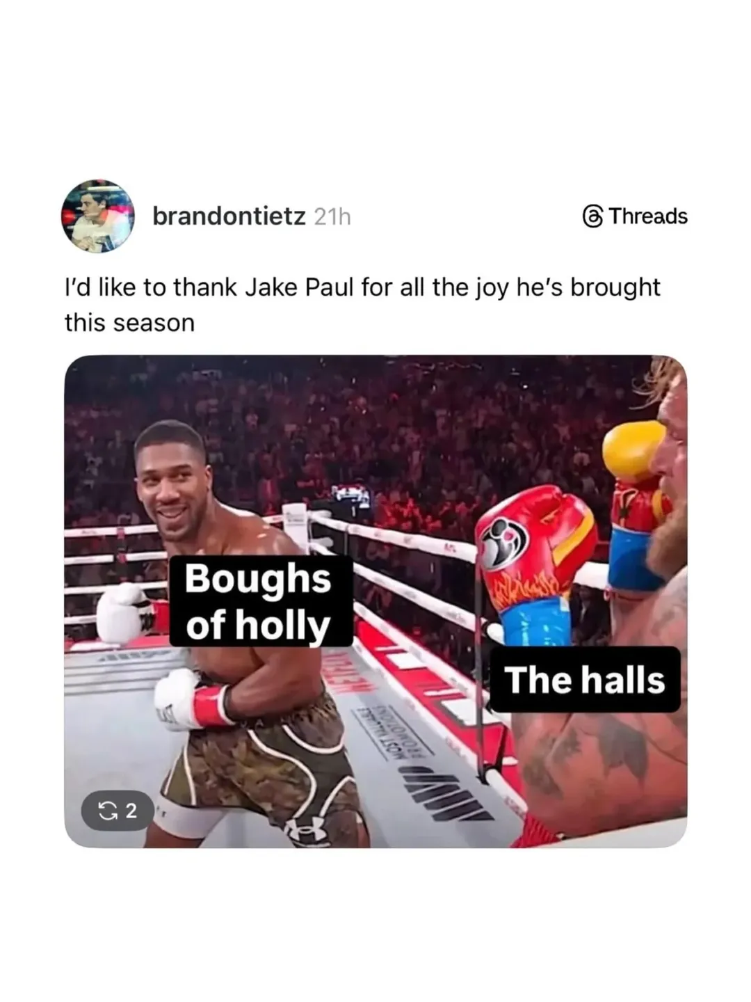 I read somewhere afterward that AJ broke Paul’s jaw in two places and he had to have emergency surgery immediately after the bout. Homeboy’s going to be eating Christmas dinner through a straw lol