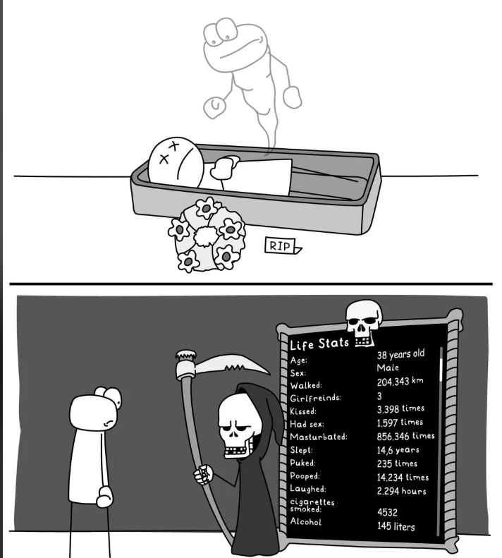 Forget stats, I want to see commented replays. Every time I missed a hint of person. Every person that got romantic/sexual feelings for me and the best time to make a move. Every time I lost something or got robbed. Shit like that. I’m really interested in that, even though it could be hell, when you realize how much you missed. To really rub salt into the wound, they could show you “what if” scenarios of missed opportunities. For example what would have happened if I did a bit better at a job interview? What if I applied for a job, where I skipped over the ad? Of course only realistic stuff and just one change. For example I never had any plans of getting a doctor and there would have been several different changes, to be remotely realistic.