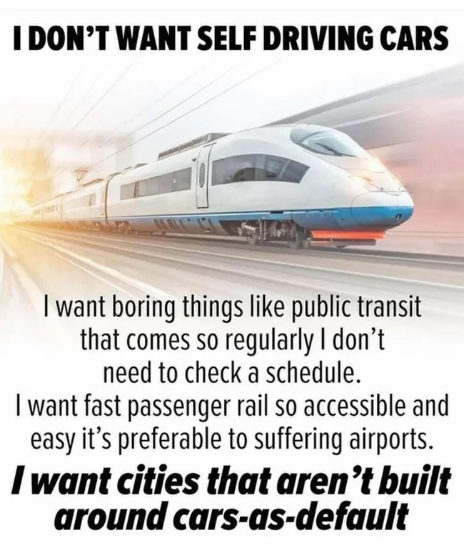 I want a self-driving car that doesn’t require parking, doesn’t spread microplastics, has dedicated lane so doesn’t get stuck in traffic, has power lines so doesn’t need batteries, and can efficiently fit and transport me and my friends. Also it’s good to make it bigger and share the costs with other passengers to make sure everyone can benefit from my awesome super duper car design. Since we are sharing it with many people, it would be nice if it just kept operating in regular, reliable hours so I can hop on and off when I need it.