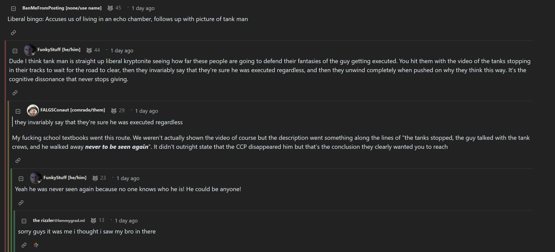 arrow-up125arrow-down1imageTankies somehow believe that Tank Man is an example of the CCP's peaceful and loving nature. Take offence at school textbooks - 'See? They're willing to stop the tanks!'sh.itjust.worksgoat@sh.itjust.worksM to MeanwhileOnGrad@sh.itjust.worksEnglish · edit-226 days agomessage-square14fedilink