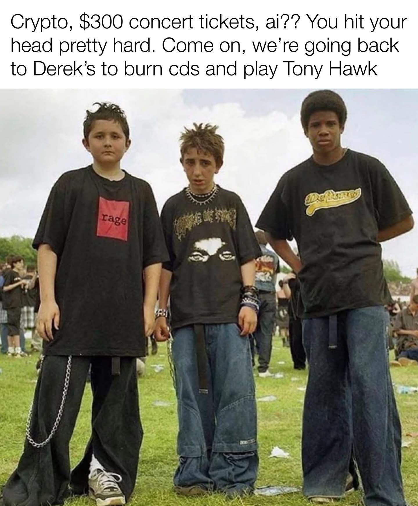 The Deftones shirt and the rage shirt gave it away. The kid wearing rage was obviously a poser and ended up in sales. I’m not sure what the shirt in the middle is but you can just tell on his face he’s gonna get busted doing some dumb shit. Your point makes sense as well, Deftones fit that style for sure.