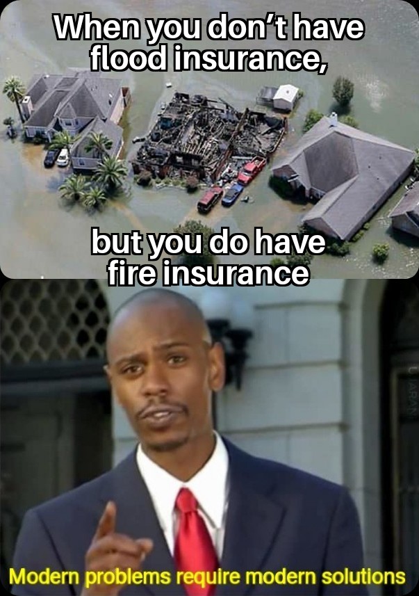They’ll probably say “the flood ruined your foundation which would have wrecked your house anyway, so you’re not covered.” or some shit like that.