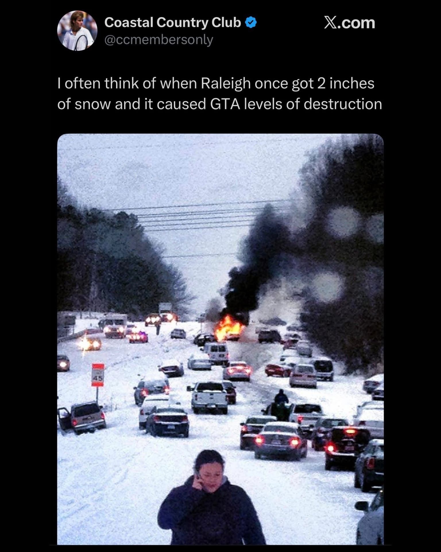 No, this year’s storm hit on a weekend, and didn’t really get going in Raleigh until nighttime. Most people stayed home. That year’s storm arrived pretty much as forecast but a lot of people ignored the forecast because a storm forecast a couple weeks earlier had fizzled out. It was around lunchtime on a weekday and everyone thought they could still stay at work and drive home and it wouldn’t be a big deal. Then the snow came quick and heavy and everyone panicked and tried to go home at the same time, unleashing rush hour traffic on bad road conditions with traffic jams blocking the plows from treating the roads.