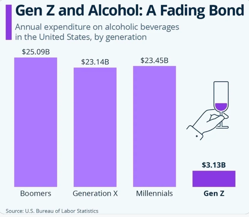 tiktok and youtube thats why. that pretty much is the new alcohol. Also things GLP-1, omezpic, and WEGOVY also is a threat to alcohol industry.