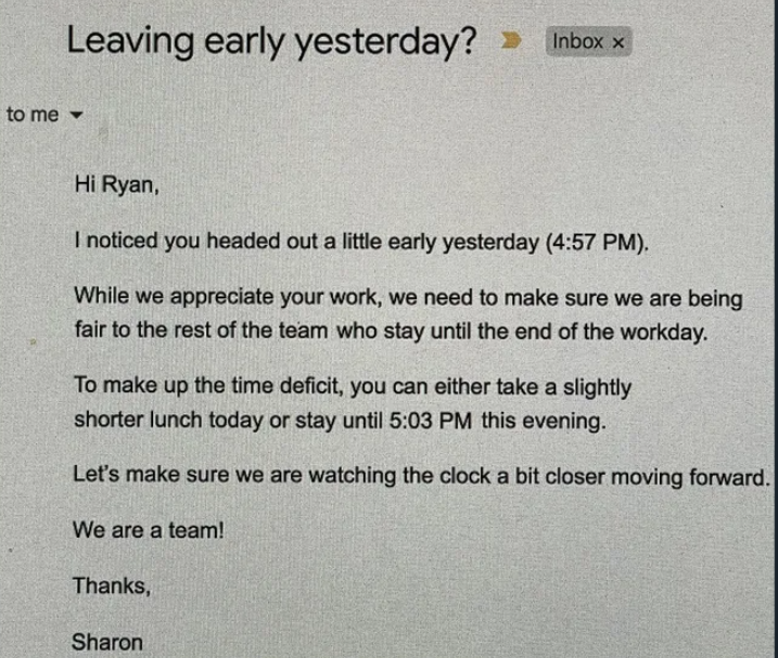That employee is never going to stay later to help with anything if they don’t have the wiggle room to leave a few minutes early.