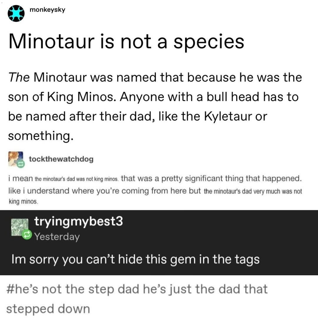 In case you are not familiar with mythology: the father of the Minotaur was a white bull sent by Poseidon to King Minos. The king didn’t sacrifice the bull, so Poseidon got mad and enticed the king’s wife to fuck the creature, thus giving birth to half-bull, half-human Minotaur. The Minotaur was then imprisoned in a labyrinth by King Minos.