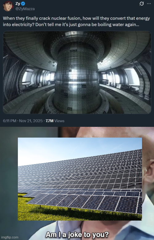 arrow-up11.12Karrow-down1imageIf God had wanted us to have nearly unlimited clean energy, He would have placed a fusion reactor into the sky.feddit.orgmxeff@feddit.org to Science Memes@mander.xyzEnglish · 7 days agomessage-square189fedilink