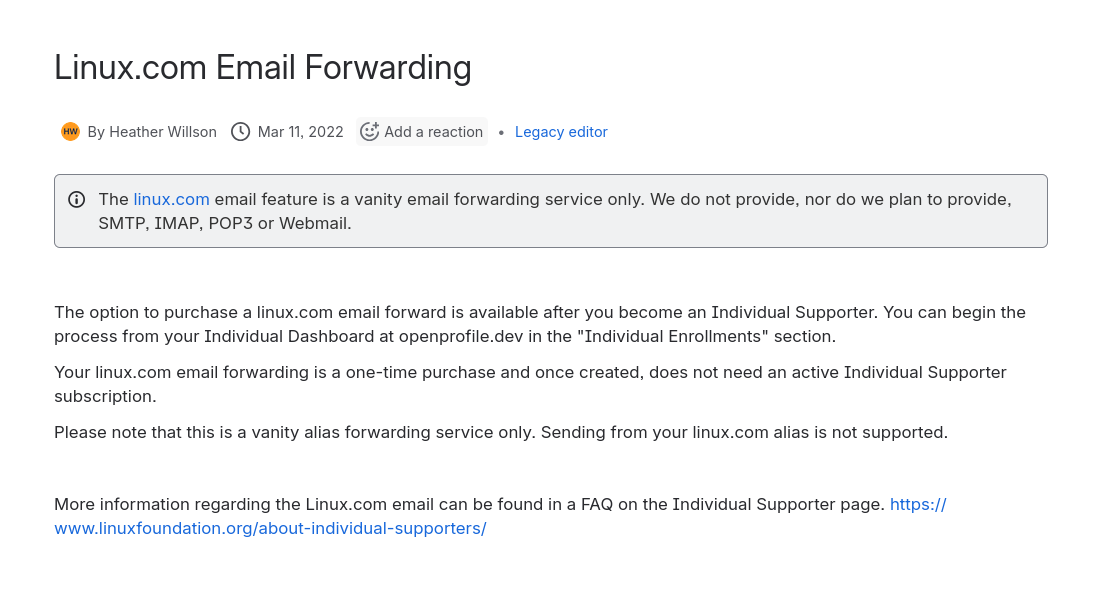 Yeah that’s right. For a whopping one time purchase of 250$, you get a lifetime license for a @linux.com domain as an email alias/forwarding only. You cannot send emails from this. You can contact support to check if the alias you want is available too.