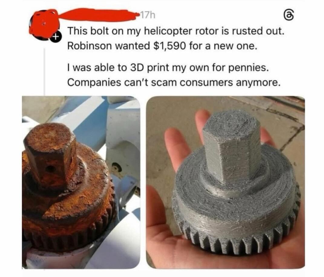 At least if that was PLA (and not a Photoshop job) there’s be no risk of it failing mid-flight. Because it would rip to shreds the second torque was applied to it.