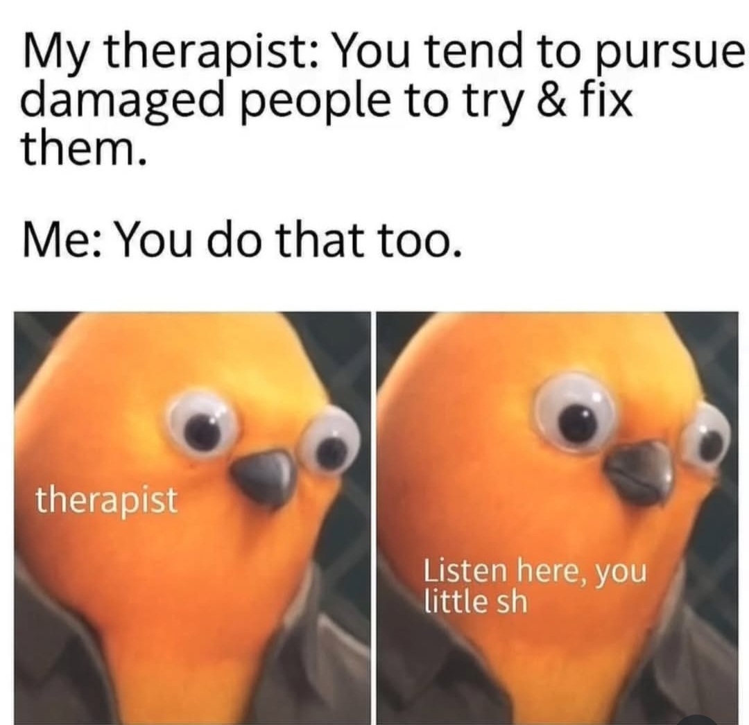 ADHD and anger issues apparently scares therapists. “Sorry my issues are a bit more complex than thinking my 3lb pampered dog hates me.”