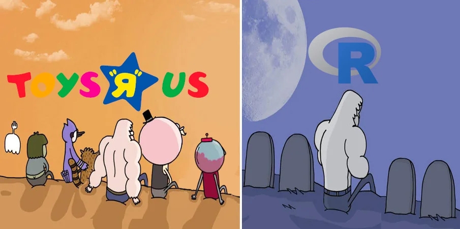 The meme features characters from the cartoon “The Regular Show”. In the first panel, all the characters are together, interestingly one character for each letter in Toys R Us. In the second panel, only the character representing the R remains, indicating the transition from childhood (toys) to adulthood (statistics). The science part of the meme is mostly just the statistical analysis reference.