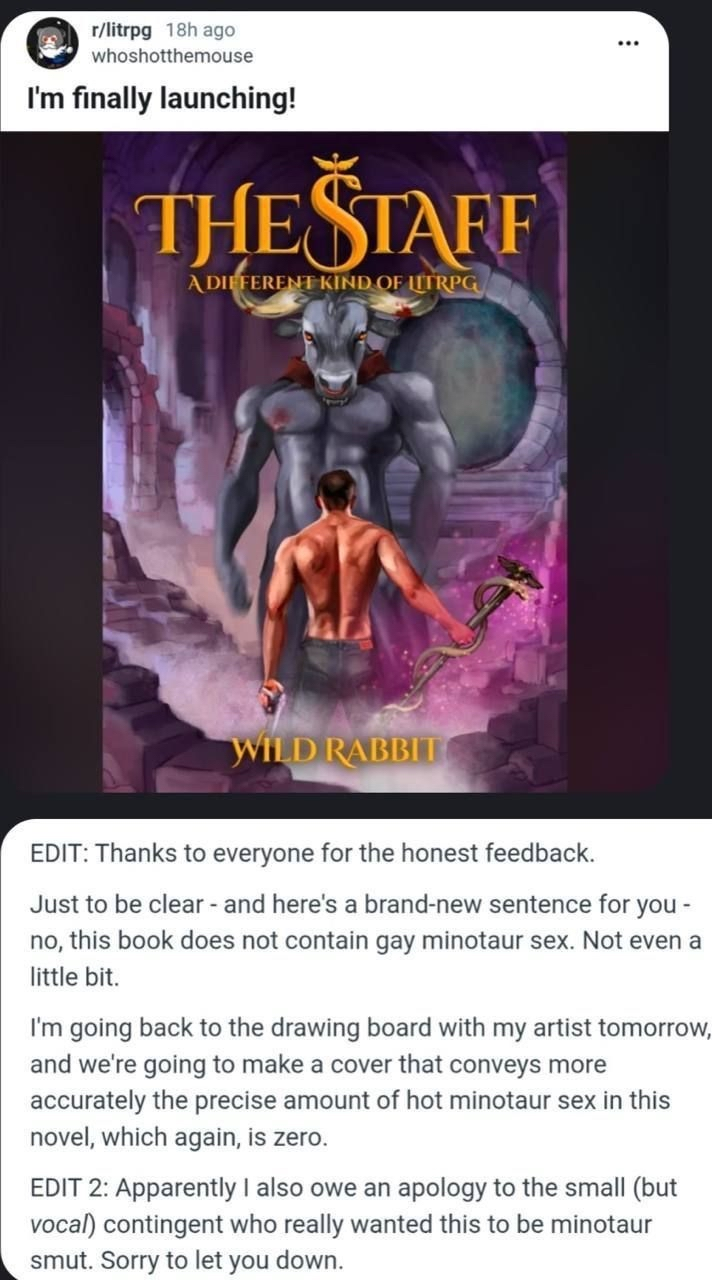 And the linked thread is basically a writing competition that the author is hosting with a $100 prize. The title is “Announcing the 2026 Beefhammer Prize For Excellence in Minotaur Erotica”. Lovely!