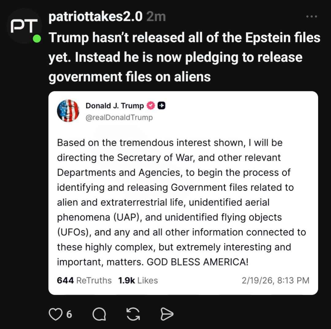 there arent any aliens visiting earth. this is another fucking trump scam / distraction / bullshit opportunity. somehow he can make it ultimately about trashing the democrats, or just distracting people from his crimes and economic destruction.