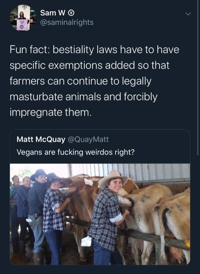 Vegans certainly talk about masturbating and forcibly imprgnating animals more than anyone else
