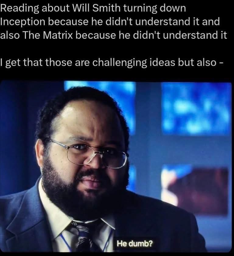 Inception, on the other hand - I can’t recall any of the characters, so I don’t know which role he was considering. It’s a perfect Will Smith movie.
