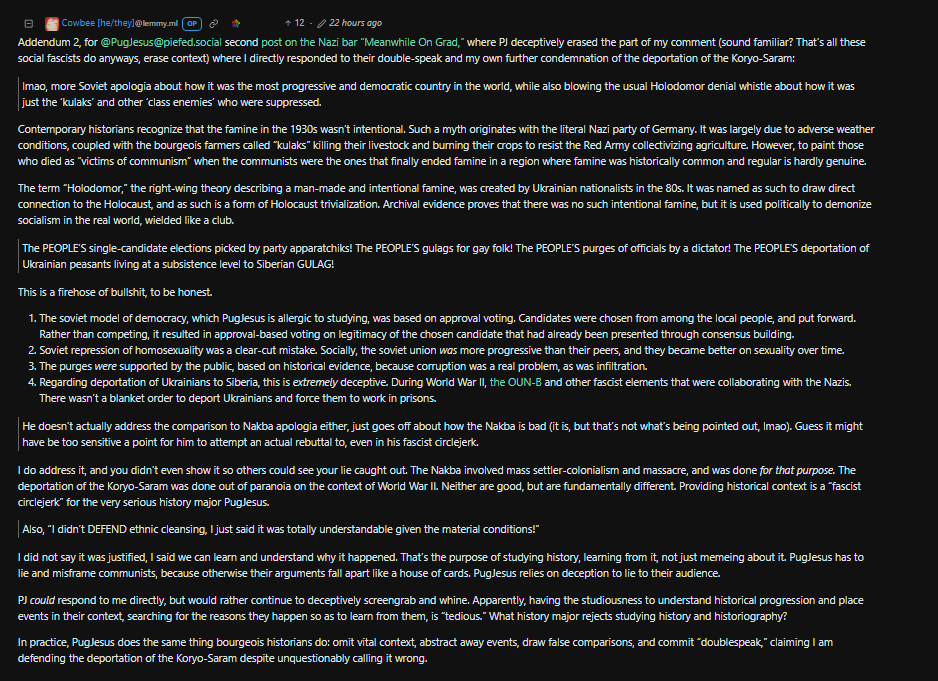 Boggles the mind that some people take ghouls like this seriously. Even moreso than genocide denial like this is allowed in any decent instance on the Fediverse. Admins need to start taking this seriously.