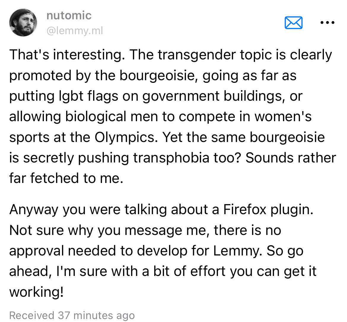 arrow-up176arrow-down1image[Transphobia Warning] Nutomic’s Stance on Transgender Peoplelemmy.caPugJesus@lemmy.world to MeanwhileOnGrad@sh.itjust.worksEnglish · 1 year agomessage-square67fedilink