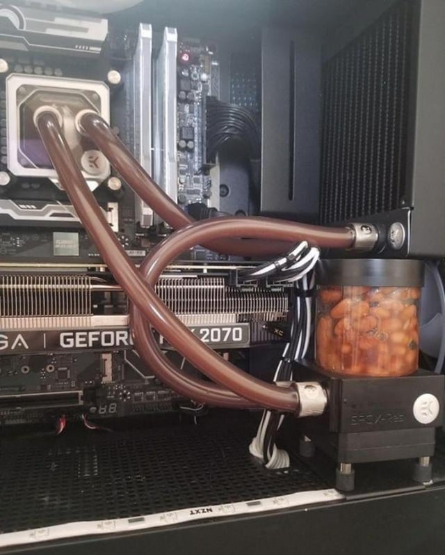 Is there something wrong with me? I think about how this can be done safely for the PC… Inf my thoughts go directly to 3 d printed beans and red brown coloured water cooling liquid…