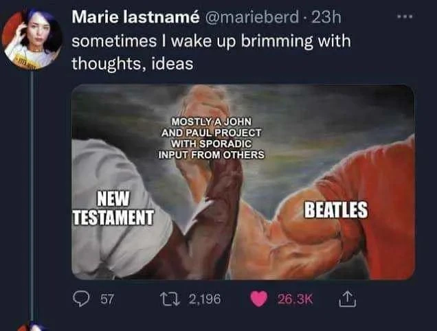 - Who is Yoko, then ? - Paul. He wasn’t a member of the group, then showed up and changed everything and killed the whole vibe. - That is a deep and satisfying insult.