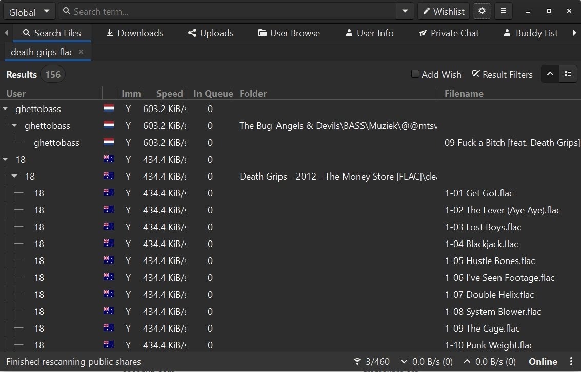 Soulseek is a file sharing network for mostly Music but also other files. The most available format for songs are MP3, M4A and FLAC. Almost any song/album is on there so you will have no problem finding what you need. You need to share files yourself otherwise there is a possibility you will get banned. I added a YouTube video tutorial so you can understand it better.